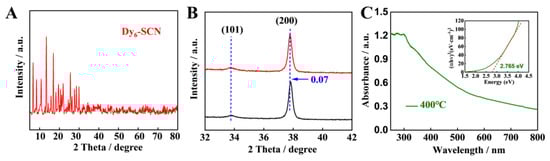 (A) X−ray diffraction (XRD) images of Dy6−SCN; (B) fine XRD patterns of Dy−OSCN/FTO electrode; (C) UV−vis DRS and Tauc plots of as-prepared Dy−OSCN/FTO electrode calcined at 400 °C.