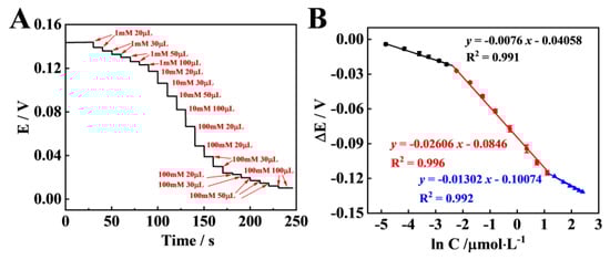 Based on the optimum experimental conditions, the property of the Dy-OSCN/FTO electrode was measured. The potential signals were decreased with the increase in the target concentration in the range of 7.94 μM to 11.13 mM (Figure 4A). In order to verify the response of the electrode to AA, the linear regression equation was calculated (Figure 4B), and there was a good three-step linear relationship between the potential responses and the target concentrations (R2 = 0.991, R2 = 0.996, R2 = 0.992). The concentrations range from 7.94 × 10−6 mol/L to 7.407 × 10−5 mol/L, and the linear regression equation was shown as ΔE(V) = −0.0076 C(mM)—0.04058, R2 = 0.991.The concentrations range from 7.407 × 10−5 mol/L to 3.029 × 10−3 mol/L, and the linear regression equation was shown as ΔE(V) = −0.02606 C(mM)—0.0846, R2 = 0.996.The concentrations range from 3.029 × 10−3 mol/L to 1.113 × 10−2 mol/L, and the linear regression equation was shown as ΔE(V) = −0.01302 C(mM)—0.10074, R2 = 0.992.