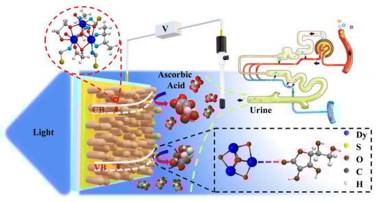 As a novel sensing method, photoelectrochemical (PEC) sensing demonstrates good performance compared to traditional electrochemical and optical sensors due to the entire isolation of the electrochemical signals and optical sources. Owing to the advantages of simple devices, low cost, fast analysis time, high sensitivity, and low background signal, the design and synthesis of semiconductor materials with excellent photoelectric chemical properties have attracted the attention of many researchers []. Although many functional nanomaterials were applied for photoelectrochemical sensing to improve the sensitivity and selectivity, the detection is still affected by the redox reaction that happens in the system. As a new detection method, the PEC potential method had almost no current flow on the electrode surface and preventing REDOX reactions between AA and other molecules on the interface. No new species entering the system meant the entire system was not compromised during testing. As an active substance, AA is prone to REDOX reaction in the detection system, and the PEC potential method provides an appropriate method for the detection of AA. Supported by the PEC potential method, an enzyme-free AA photoelectrochemical (PEC) potential detection system based on a Dy-OSCN monocrystal semiconductor was developed. The regular structure of Dy-OSCN [,,] is favorable for the separation and transmission of carriers in the semiconductor under light excitation. Meanwhile, when Dy6-SCN was modified on the electrode surface and calcined in the tube furnace to generate Dy-OSCN, it would possess the advantage of stable chemical properties and light corrosion-resistant, which greatly improves the stability and repeatability of detection. Moreover, the prepared sensor achieved a good RSD (relative standard deviation) in the actual detection of human urine. In summary, this study establishes a novel PEC potential system and uses it for the detection of AA for the first time. The use of Dy-OSCN achieves a low-cost, rapid and accurate determination of AA that can provide a new idea for the molecular detection of human vital substances.