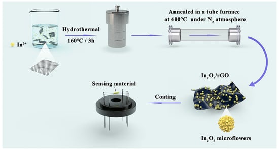 In recent years, two-dimensional (2D) graphene-based nanomaterials, including graphene oxide (GO) and reduced graphene oxide (rGO), have been extensively studied as potential gas-sensing materials due to their high specific surface area, outstanding electrical properties, abundant functional groups, and excellent charge-carrier mobility. [27,28]. Unfortunately, the low sensing response, slow response and recovery rates, and poor selectivity of graphene-based sensing materials limit their practical application. Taking into account the advantages of GO/rGO and MOX, the construction of GO/MOX or rGO/MOX hybrid micro–nanostructures is considered an effective way to enhance gas-sensing performances [29,30,31,32]. To date, a number of GO/MOX or rGO/MOX hybrids—such as SnO2/rGO, rGO/Co3O4, rGO/WO3, rGO/In2O3, ZnO/rGO, etc.—have been prepared, and demonstrate good sensing performance in detecting both oxidizing and reducing gases [33,34,35,36,37,38]. For instance, Meng et al. [33] prepared rGO/Co3O4 nanocomposites via a one-step hydrothermal method, which could detect ppb level xylene. Cao et al. [37] constructed ZnO/rGO heterostructures through a chemiresistive approach, exhibiting good linearity in the ppb range, high selectivity, and good long-term stability for NO2. Inspired by the above results, it is hoped that researchers will be able to uniformly distribute 3D In2O3 flower-like structures on 2D rGO sheets via a feasible and economic route for developing an acetone gas sensor with high performance.