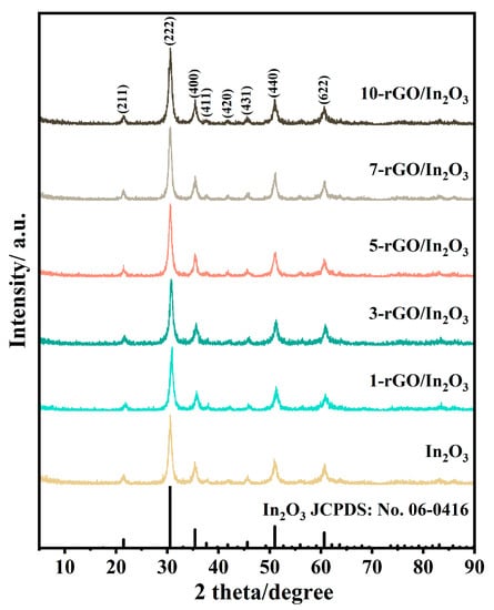 XRD patterns of the pure In2O3, 1-rGO/In2O3, 3-rGO/In2O3, 5-rGO/In2O3, 7-rGO/In2O3, and 10-rGO/In2O3.