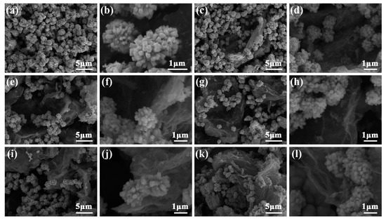 The morphology of the In2O3 and rGO/In2O3 composites was investigated by FE-SEM, as shown in Figure 3. The low-magnification FE-SEM image (Figure 3a) clearly demonstrates numerous 3D In2O3 flower-like structures with diameters ranging from 1 to 2 μm. These flower-like structures were composed of nanorods with diameters of 100 to 300 nm (Figure 3b), and a specific spacing between each nanorod was clearly observed, illustrating their porous structures. From the FE-SEM images of the 1-rGO/In2O3 composites (Figure 3c,d), it is clear that the 3D In2O3 flower-like structures remained, and some of them uniformly attached to the surface of the rGO sheets, forming a 3D interconnected structure, and thereby contributing to enhancement of the sensing properties. Moreover, the crumpled rGO sheets with many folds and wrinkles exhibited a clean and transparent film. The morphologies of the 3-rGO/In2O3, 5-rGO/In2O3, 7-rGO/In2O3, and 10-rGO/In2O3 composites were similar to that of the 1-rGO/In2O3 composites, as shown in Figure 3e–l. It is worth noting that there were no significant changes in the size and the uniformity of the In2O3 flower-like structures. Additionally, with increasing the mass ratio of rGO, many ultrathin layered structures were observed, and some of them tend to aggregate with one another, which is unfavorable for the gas-sensing property.