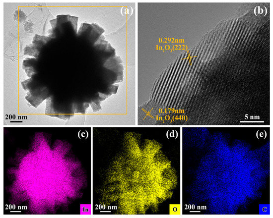 The In2O3 flower-like structures attached on the rGO sheets were also clearly observed in the TEM image (Figure 4a), consistent with the FE-SEM image. The HRTEM image (Figure 4b) shows that 0.292 and 0.179 nm lattice spacings fit well with the (222) and (440) crystal planes of In2O3 [40]. Meanwhile, the EDS elemental mappings (Figure 4c–e) clearly indicate that the In, O, and C are uniformly distributed throughout the whole region, further implying the formation of the rGO/In2O3 composites. Taking the results of the FE-SEM and TEM observations into account, it is possible to conclude that the rGO/In2O3 composites were successfully prepared.
