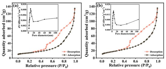 The nitrogen adsorption–desorption measurements were performed to further confirm the specific surface area and porous structures of the samples. From Figure 6a,b, it can be seen that both of the curves are recognized as type IV isotherms with obvious hysteresis loops, indicating the formation of mesopores in the samples [45]. The specific surface area of the In2O3 and 5-rGO/In2O3 composites was calculated to be 35.4 and 64.6 m2/g, respectively. Obviously, the surface area of the 5-rGO/In2O3 composites was significantly higher than that of pure In2O3, due to the introduction of rGO. The pore size distribution diagram (inset) shows that the pore size of the In2O3 and rGO/In2O3 composites was predominantly concentrated at 8.129 and 6.124 nm, respectively, indicating the existence of many mesopores in the products. As a result, the rGO/In2O3 composites possess a higher specific surface area and a porous structure, which is advantageous for effective gas absorption and diffusion, contributing to the improved sensing performance.