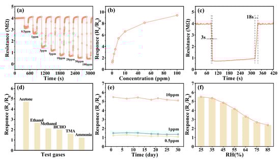 (a) The transient response and recovery curves for acetone in the range of 0.5–100 ppm. (b) The corresponding sensing response as a function of acetone concentration. (c) The dynamic sensing transients to 10 ppm acetone. (d) The selectivity and (e) long-term stability for 0.5/1/10 ppm acetone. Here, the sensor is made of 5-rGO/In2O3 composites, and the operating temperature is 150 °C. (f) The sensing responses to 10 ppm acetone under different relative humidity levels at 150 °C.