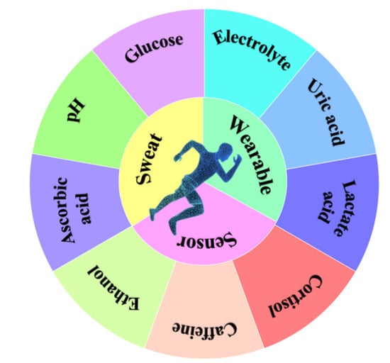 Perspiration is produced through sweat glands distributed throughout the human body. The interest of researchers has been centered on the composition and function of perspiration. Perspiration contains abundant biomarkers, providing insights into potential physiological and metabolic processes, making it an attractive liquid for noninvasive physiological monitoring including glucose [], lactic acid [], electrolytes [], pH value [], cortisol [], vitamins [], ethanol [] and drugs [], which are related to different physiological processes such as dehydration, fatigue, mental stress, or disease (Figure 1). Therefore, understanding the physiological level and correlation of sweat components and health evaluation is the key to establishing an intelligent health monitoring device, which means that the component analysis of sweat has attracted the attention of relevant physiological monitoring and noninvasive disease diagnosis [].