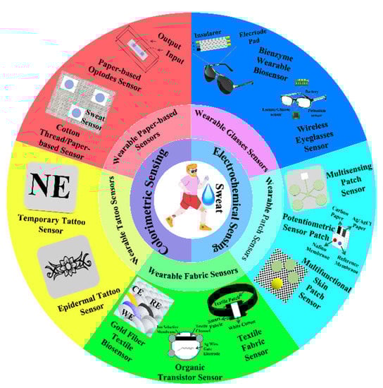 Blood has long been the first choice for the physical diagnosis of people because advanced clinical technology can help us deepen our understanding of health. The results of the blood test can include glucose, lactate, protein, uric acid, electrolyte ions, etc. []. Many substances are also commonly found in sweat. According to the results of the blood test, we can judge and evaluate according to the reference standard, but the frequency of our exposure to them is simply not enough to predict or to prevent health problems. From the perspective of invasive blood testing, noninvasive sweat analysis can avoid trauma to the human body and avoid infection, and at the same time, save on expensive costs, and has certain development prospects. Natural sweating behavior increases sweating due to stress, stressful psychological states, ambient temperature, and exercise behavior, and decreases due to cold as well as being affected by hormonal imbalances, an overactive thyroid and sympathetic nervous system, and certain foods and medications []. However, under certain behavioral conditions, for the purpose of sampling sweat samples, the sweating skin area can be stimulated by heat or a chemical such as pilocarpine with a low-intensity current to obtain a sufficient sweat volume for subsequent analysis [,].