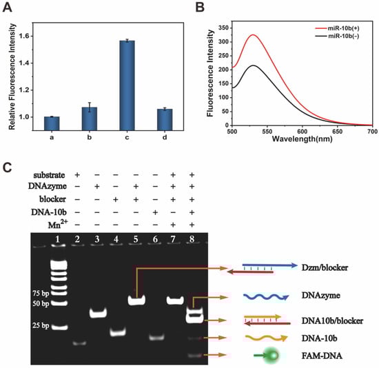The feasibility of the detection of miR-10b with the DNAzyme amplification strategy. (A) The relative fluorescence intensity of the solution under different conditions: (a) substrate; (b) substrate + DNAzyme; (c) substrate + DNAzyme + Mn2+; (d) substrate + Dzm/blocker + Mn2+. Error bars represent the standard deviation of three determinations. (B) The fluorescence emission spectra of the DNAzyme amplifier in the absence and presence of miR-10b. Experimental conditions: miR-10b concentration of 50 nM, substrate concentration of 25 nM, DNAzyme concentration of 25 nM, blocker concentration of 30 nM, Mn2+ concentration of 750 μM, 25 mM Tris-HCl buffer (containing 137 mM NaCl, pH 7.0). (C) Polypropylene gel electrophoresis, lane 1: DNA marker (25–500 bp); lane 2: substrate; lane 3: DNAzyme; lane 4: blocker; lane 5: Dzm/blocker; lane 6: DNA-10b; lane 7: substrate + Dzm/blocker + Mn2+; lane 8: substrate + Dzm/blocker + Mn2+ + DNA-10b.
