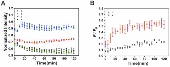 To further demonstrate how the presence of miR-10b can successfully activate DNAzyme cycle amplification, the fluorescence recovery intensity of the DNAzyme amplifier cycle was compared with that of single DNAzyme catalysis. Changes in the time-dependent fluorescence signal of the developed DNAzyme amplifier were monitored using a time interval of 5 min. The fluorescence signal of the substrate changed negligibly in 120 min in the absence of the DNAzyme, demonstrating that it was stable in the buffer (Figure 2A, curve a). The presence of DNAzyme can indeed cleave the substrate chain into short chains with the help of Mn2+, resulting in slight fluorescence recovery (Figure 2A, curve b). This cleavage reaction could not happen once the DNAzyme activity was inhibited in the presence of the blocker sequence (Figure 2A, curve c). Only in the presence of miR-10b could the DNAzyme cycle amplification be activated by releasing the DNAzyme for recycling; thus, it achieved the highest fluorescence recovery signal in a short time (15 min) and remained stable for 120 min (Figure 2A, curve d). This result showed that the DNAzyme amplifer with miR-10b can perform a faster and more efficient cleaving cycle reaction than the single DNAzyme catalysis substrate. Moreover, the comparison of the fluorescence signal ratio (F/F0) in Figure 2B further demonstrates that DNAzyme cycle amplifier had a higher substrate-cleaving efficiency than the single DNAzyme cleaving.