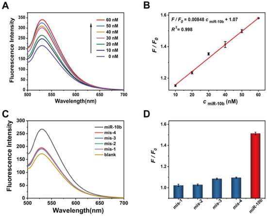 (A) Fluorescence emission spectra of the DNAzyme amplifier in the presence of different concentrations of miR-10b, from bottom to top: 0 nM, 10 nM, 20 nM, 30 nM, 40 nM, 50 nM, and 60 nM. (B) The linear relationship between F/F0 and the concentration of miR-10b. (C) Fluorescence emission spectra of the DNAzyme amplifier in the presence of miR-10b and homologous miRNAs sequences with different mismatch bases. (D) Selectivity for the detection of miR-10b. Error bars represented the standard deviation of three determinations. Experimental conditions: substrate concentration of 25 nM, DNAzyme concentration of 25 nM, blocker concentration of 30 nM, Mn2+ concentration of 750 μM, 25 mM Tris-HCl buffer (containing 137 mM NaCl, pH 7.0).