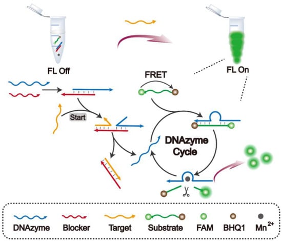 DNAzyme exhibits an excellent catalytic activity for specific substrate chains containing an RNA strand (rA) as an embedded cleavage site []. Additionally, DNAzyme-mediated cleavage reactions can take place at room temperature with the assistance of different metal ions, such as Na+, Mg2+, Zn2+, Mn2+, and Cu2+ [,]. Because of its cofactor specificity and cycling catalytic ability, metal ion-assisted DNAzyme amplifiers have been successfully applied for the detection and analysis of metal ions, nucleic acids, proteins, and small molecules. For example, Lu et al. [] developed a signal amplification strategy based on DNAzyme catalytic cutting and the utilization of CHA to detect low concentrations of endogenous metal ions in cells. Furthermore, they also took advantage of DNAzyme to establish an aptamer sensing platform based on the combination of magnetic beads and DNAzyme for the highly sensitive detection of small molecules such as toxins [,]. Based on this, there is the potential to construct a universal DNAzyme amplifier through integration of the programmable nature of DNA nanodevices and the catalytic capability of DNAzyme, which can be conveniently applied for the detection of a wide range of pancreatic cancer-related miRNAs through reasonable sequence design.