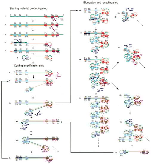 Loop-mediated isothermal amplification (LAMP) was first proposed in 2000 []. It is a very specific one-step reaction that uses four target-specific primers, namely an internal forward primer (FIP), an internal reverse primer (BIP), and two external primers (F3 and B3), to recognize six different sites present at the level of the DNA sequence to be amplified. FIP and BIP primers contain two functional sequences, one for priming extension in the first step and the other for self-priming in the second step of the reaction, corresponding to the sense and antisense sequences of the dsDNA target. As mentioned above, the reaction takes place in two phases and is catalyzed by Bst DNA polymerase: the first phase is the formation of the starting structure in which all four primers are used, whereas the second one is the phase of cyclic amplification, where only the internal primers are used. The complete process of LAMP isothermal amplification is shown in Figure 1.