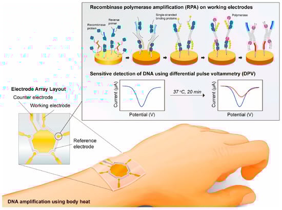 In addition to the detection of bacteria, the detection of viruses is also becoming increasingly important, given the recent SARS-CoV-2 pandemic. COVID-19 is a viral respiratory infection that is part of severe acute respiratory syndromes []. The SARS-CoV-2 pandemic started in 2019 when the first case was identified in December in Wuhan, China, and is presumably due to animal-to-human transmission []. Therefore, in addition to antiviral treatment and the use of vaccines, early diagnosis is also necessary to reduce the virulence of the disease and prevent transmission []. The diagnostic tests that are in use today involve PCR, but, to simplify the analysis, a procedure without the need for thermocycling and based on isothermal amplification could be used. Interestingly, RPA combined with electrochemical devices has enabled the development of wearable devices. Indeed, the temperature used in RPA (i.e., 37 °C) allows these systems to operate by simple skin contact, hence eliminating the need for an external heating device. Several studies have already been reported in the literature focusing on devices that run RPA by exploiting body temperature. Among those, Kim and co-workers [] designed an electrochemical biosensor based on microelectrode array chips consisting of five individual gold working electrodes for the determination of multiple target genes related to SARS-CoV-2 by DPV. This allows the measurement of different targets or the repeated measurement of the same target for at least three times, avoiding any misdiagnosis. Notably, the RPA isothermal amplification was carried out at human body temperature for 20 min and led to the hybridization of amplicons with thiol-modified primers immobilized on the working electrode. A decrease in current density can be noted as the amplicons accumulate, as displayed in Figure 4.