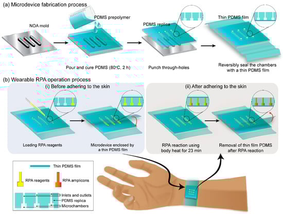 - Trinh, K.T.L.; Lee, N.Y. Fabrication of Wearable PDMS Device for Rapid Detection of Nucleic Acids via Recombinase Polymerase Amplification Operated by Human Body Heat. Biosensors 2022, 12, 72. [Google Scholar] [CrossRef] [PubMed]