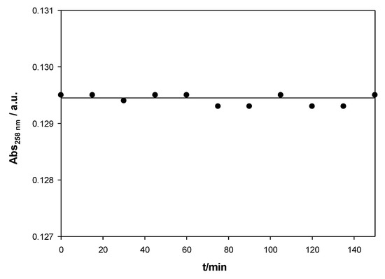 Stability of a calixarene/ct-DNA solution (X = 0.008 and [ct-DNA] = 2.00 × 10−5 mol∙dm−3).