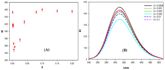 (A) Representation of the fluorescence emission intensity of Schiff Base calixarene/ct-DNA solutions on X, at a fixed macrocycle concentration ([calixarene] = 2.00 × 10−6 mol∙dm−3). Error bars represent the standard deviation for each X value (n = 5). (B) Emission spectrum of the difluorene-diester calixarene at different X values.