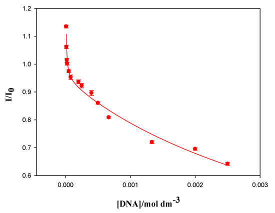 Dependence of the I/I0 ratio of the difluorene-calixarene diester/ct-DNA solution on the polynucleotide concentration ([calixarene]= 2.00 × 10−6 mol∙dm−3). The solid line corresponds to the multiparameter fit obtained using Equation (4). Error bars represent the standard deviation for each polynucleotide concentration value (n = 5).