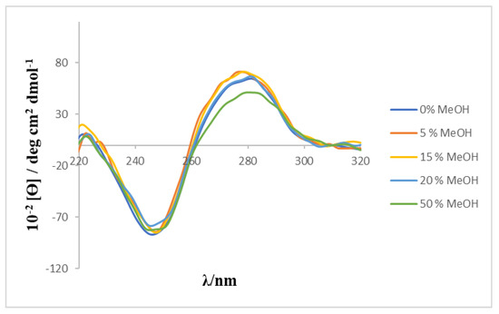 Circular dichroism spectra of calixarene-ct-DNA solutions were carried out at a constant polynucleotide concentration and different macrocycle concentrations. These studies were intended to determine possible conformational changes in the ct-DNA molecules due to their interactions with the calixarene. ct-DNA in aqueous solution adopts a right-handed B-form conformation, showing a characteristic CD spectrum in the near ultraviolet region (220–320 nm). The spectrum showed a positive band at approximately 278 nm and a negative one at 247 nm. These bands are caused, respectively, by the π–π stacking interactions between the base pairs and by the helical superstructure of the polynucleotide that generates an asymmetric environment for the bases [22]. The conformational alterations of ct-DNA, caused by its interaction with different ligands, produces changes in its CD spectrum [23,24]. Given that a MeOH/H2O mixture was used as solvent because of the low solubility of the calixarene, a preliminary study was carried out to check the effect of the MeOH percentage on the CD spectrum of ct-DNA. The results (see Figure 4) showed that the characteristic bands of the CD spectrum of ct-DNA do not undergo any modification in the presence of the content of alcohol used in the present work.