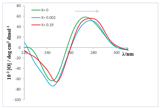 As can be seen, the molar ellipticity of both bands decreases within the range 0 < X < 0.002. In addition, although the profile or shape of the spectrum remained constant throughout the range of X values studied, the bands showed a bathochromic shift of approximately 3 nm when X increased (see Figure 6). This observed shift could be related to the polynucleotide denaturation; that is, the separation of the ct-DNA double helix, resulting in two single-stranded ct-DNA molecules [17]. Since the ct-DNA chains are held together by hydrogen bonds between complementary base pairs, a possible intercalation of the macrocycles between them could disrupt the hydrogen bond between the base pairs thereby affecting the spectrum. Another possibility, mentioned previously, is the potential formation of calixarene dimers which may also affect the conformation of ct-DNA. To obtain additional information on this issue, viscosity and melting temperature measurements were performed.