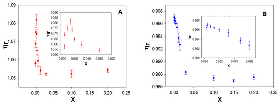 Relative viscosity of the calixarene/ds-DNA (A) and calixarene/ss-DNA (B) solutions at different values of X ([DNA] = 2.00 × 10−5 mol dm−3). Inserts show the relative viscosity data at low X values. Error bars represent the standard deviation for each value of X (n = 10).