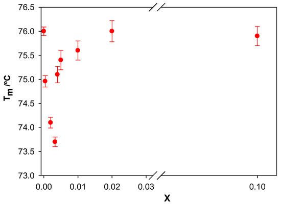 Figure 9 shows the dependence of Tm on the molar ratio X. An initial decrease in melting temperature was observed in the range of X from 0 to 0.003. A further increase in X resulted in an increase in Tm. It is seen that the values of X where a minimum point of Tm was observed coincided with those observed from the viscosity measurements.
