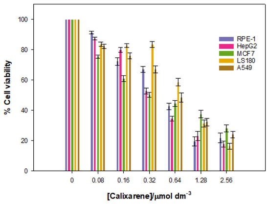 Cytotoxicity was investigated at calixarene concentrations from 0 to 2.56 µmol dm−3. An MTT assay was used for in vitro results [18]. Calixarene concentrations higher than 2.56 µmol dm−3 could not be used due to their poor solubility. The cell lines used were RPE-1 (normal cell line), HepG2 (human liver cancer cell line), A549 (adenocarcinomic human alveolar basal epithelial cell line), MCF7 (breast cancer cell line), and LS180 (adenocarcinomic human colonic epithelial cell line), and received from the IBiS (the Institute of Biomedicine of Seville) which were from commercial suppliers. Cell lines were plated out into 96-well plates at a density of 3000 cells per plate and incubated. After 24 h, different calixarene solutions of varying concentrations were added to the wells, and the plate was returned to the incubator for 2 more days. Subsequently, they were pulsed with MTS (ROCHE, Basilea, Switzerland). Cell viability was measured by luminometry in a Varioskan Flash (Thermo Fisher Scientific, Waltham, MA, USA) in accordance with the manufacturer instructions. Each calixarene concentration was measured in triplicate.