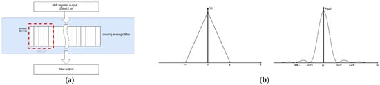 (a) Structure of the moving-average filter on FPGA. (b) Determination of the filter orders for the spectrum data using Fourier transformation.
