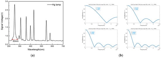 (a) Determination of the valid spectrum signal frequency using Hg lamp spectrum measured by this system. (b) Amplitude–frequency response curve at different filter orders of the moving-average filter.
