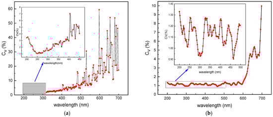 is the standard deviation of the samples and is the average value of the samples. The coefficient of variation () shows the dispersion degree of the measurement and can reflect the stability of the instrument. The spectrum signal at each wavelength was tested 40 times to calculate , using deionized water as a tested solution. Figure 7a,b show the global comparison at a wavelength range of 200~700 nm. The result shows that the stability of the system was greatly improved at all UV-Vis wavelengths after the digital filter was implemented, especially at the wavelength of the visible light range. The average coefficient of variation of the measurements in all wavelengths (200~700 nm) was reduced from 9.57% to 1.74%, which reached the average accuracy of the common online UV-Vis instruments for water-quality monitoring []. The maximum , which indicated the worst case of the measurement, was reduced from 59.38% to 9.79%.