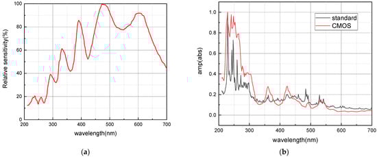 (a) CMOS sensor’s relative sensitivity. (b) Spectrum comparison of xenon lamp between standard dataset and the CMOS-based system.