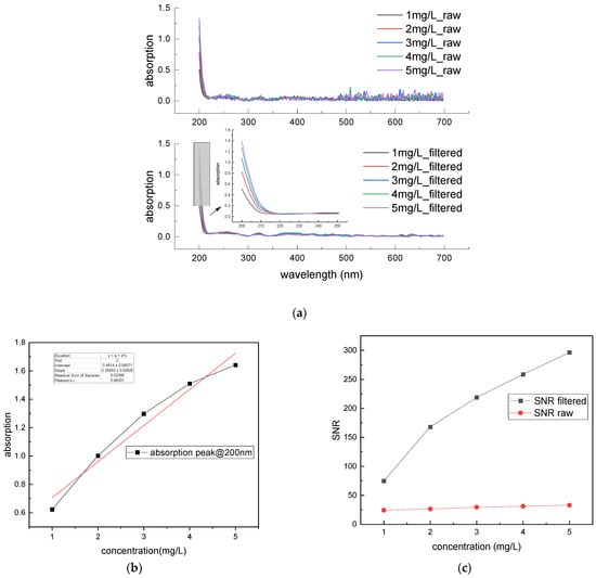 (a) Filter result for absorption spectrum of nitrate in concentration from 1~5 mg/L. (b) Linear fitting result between nitrate concentration and sum of the absorption value at the wavelength of 200 nm. (c) SNR comparison for absorption spectrum of nitrate.