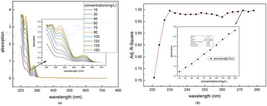 We then measured the absorption spectrum of the chemical oxygen demand (COD) solution at the concentration range of 15 mg/L to 150 mg/L in 10 groups. The COD solution of different concentrations was prepared by dissolving the potassium hydrogen phthalate into the deionized water; the result is illustrated in Figure 10a. The result shows that each nitrate concentration has a well-differentiated absorption magnitude in the wavelength range from 230 nm to 280 nm. The linear fitting procedure between the COD concentration and the absorption value was completed at each wavelength in a range from 230 nm to 280 nm, and the coefficient of determination (adjusted R-Square values) at each wavelength is illustrated in Figure 10b. The result shows that at the wavelength of 270 nm, the concentration of COD shows the best linearity with the absorption magnitude, and the adjusted R-Square value at this wavelength is beyond 0.99.