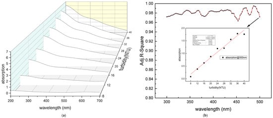 (a) Absorption spectrum of turbidity in different concentrations. (b) Adjusted R-Square value at the wavelength range of 300 to 500 nm.