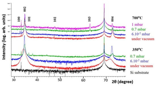 Pure ZnO phase is obtained whatever the deposition conditions are, and all peaks are indexed in a Würtzite-type structure (ICDD PDF Card n°00-080-0075). Two intense peaks, indexed as the (002) and (004) reflections of the hexagonal structure, show that the films present a high c-axis oriented growth, as usually observed with Si or glass substrates and whatever the deposition method [,,,,]. The presence of native oxide on the surface of the substrate, and more precisely oxygen atoms, leads to a preferential attraction of Zn atoms; in the Würtzite structure, the higher density of Zn atoms is along the (00ℓ) planes, which could favor this growth orientation []. However, the pressure increase leads to polycrystalline growth, regardless of the deposition temperature.