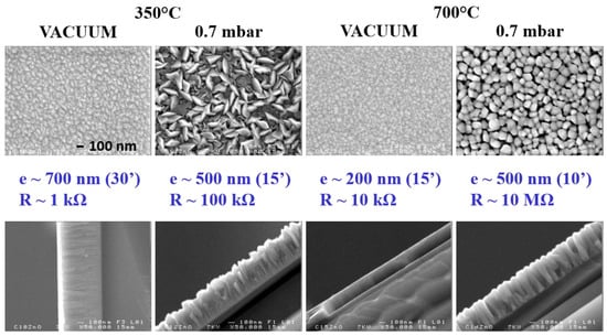 The morphology of the thin films is strongly dependent on the deposition conditions as illustrated in Figure 2. Dense and continuous films were obtained under vacuum and with 0.06 mbar oxygen pressure (not shown), while porous films formed by quite circular grains of 100 to 150 nm in diameter are observed at 700 °C with oxygen. At 350 °C under oxygen, the shape of the grains is quite different: large and more or less flat grains of various shapes appear. However, all films present a columnar growth. The films have a thickness ranging from 200 to 700 nm and a resistance varying from 1 kΩ to 10 MΩ also depending on the deposition conditions; thus, at a fixed temperature, a higher oxygen pressure leads to a thicker film with higher electrical resistance. Under exposition to oxygen and when the deposition temperature is increased, then the film thickness and its resistance increase. Similarly, and as expected, the increase in laser frequency or deposition time increases the thickness of the film, but on the other hand, induces a decrease in its resistance. The grain size increases with the oxygen pressure as clearly shown in Figure 2. So, the c-axis oriented growth and the microstructure of ZnO/Si (100) thin films can be perfectly tuned by the deposition conditions.