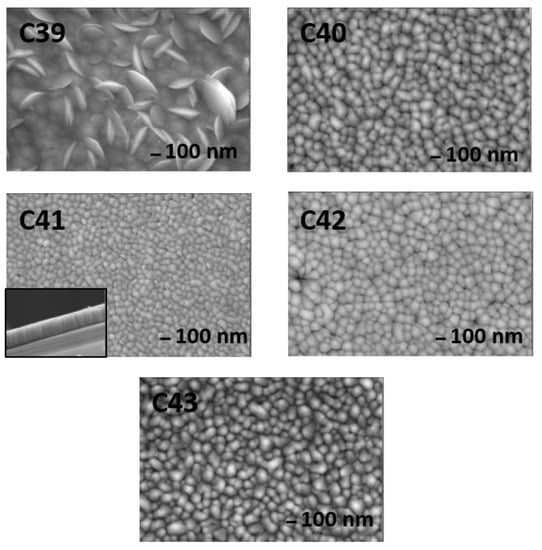 All films have a homogeneous, rather dense surface. The same morphologies than those already observed for ZnO/Si films are found again; large flat disk-shaped grains (200 ≤ Ø ≤ 400 nm) in case of C39 or small quite circular grains (30 ≤ Ø ≤ 150 nm) for C40 to C43, with a columnar growth (Figure 3). The film thicknesses are, respectively, around 450 nm (C40 and C41), 500 nm (C43), 600 nm (C39) and 1000 nm (C42).