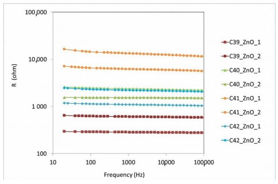 Before the integration in gas sensor packages, AC measurements were performed for measuring the evolution of film resistances. So, we only give here the real part of the measured impedance, as the sample (here in inter-digitated configuration) model is a parallel (R,C) model. The knowledge of the resistance value was important because the electronic conditioner was designed in function of this value. The results are given in Figure 4 in the 20 Hz to 1 MHz frequency range, for two samples of each kind of film. The lowest values were measured on the film C39 with values always lower than 1 kΩ. The highest ones were given by film C41 with values around 10 kΩ. The evolution of the resistance can be easily linked to the microstructure differences. The film C39 is completely different when compared to the four others, because it is not composed of circular grains, but mainly of disc-like grains arranged in different directions. The film C41 is very dense and composed of very fine grains, mainly circular, of diameters ranging from 30 to 90 nm. Between these two films, the others show a microstructure similar to film C41, but with bigger grains.