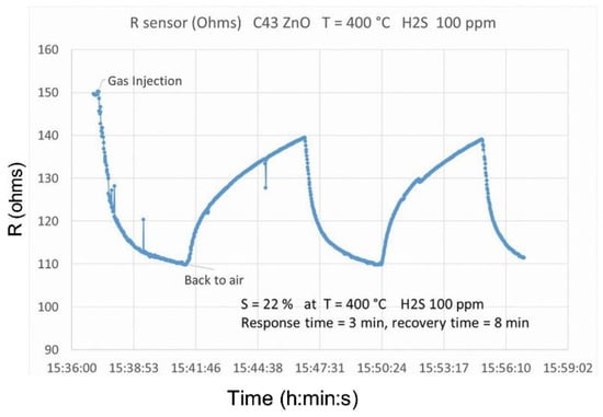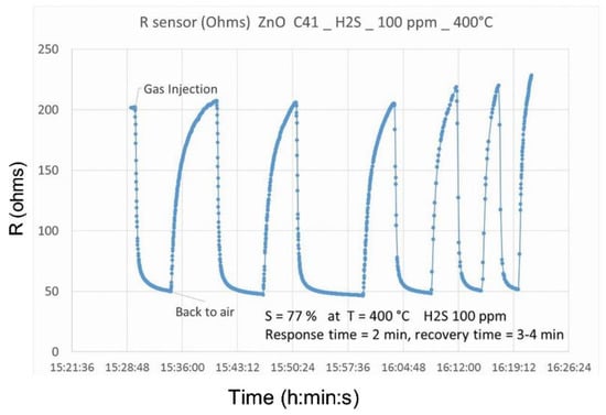 All gas sensors were tested under different concentrations of H2S and in a large temperature range for defining the optimal operating temperature with the maximum sensitivity. The ZnO sensors have given an optimal response at 400 °C. In view to compare our results to current commercial semiconductor gas sensors, measurements under H2S were also completed with sensors from Figaro and Winsen corporations [,,]. All the results on the sensitivity under 100 ppm H2S concentration are plotted in Figure 7, Figure 8, Figure 9, Figure 10 and Figure 11. The sensitivity value calculated from Equation (2) is given on each figure. The average sensitivity values of the ZnO sensors are really of interest, as no optimization of the sensor volume was performed to increase the sensitivity at this time. About the dynamic response, all values of response and recovery times are also given in each figure. These dynamic time values were measured for a response of 90% of the complete response, i.e., when reaching saturation.