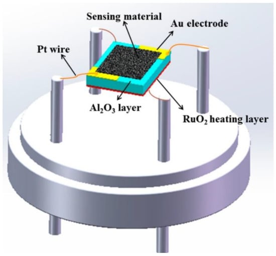 Schematic illustration of an MOS-based gas sensor, showing the sensing material, electrodes, and heater. Reprinted with permission from Ref. [20]. Copyright 2020, MDPI.