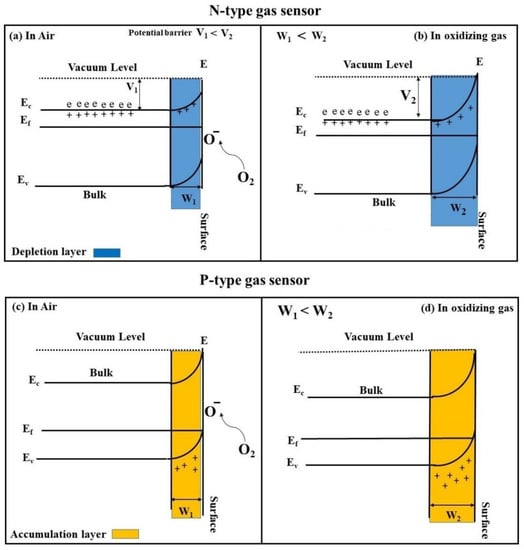 It is well accepted that the variation of the resistance in the presence of the target gas is the basic mechanism of gas detection by resistive gas sensors. A schematic of the sensing mechanism for n- and p-type MOS sensors in the presence of an oxidizing gas is shown in Figure 3. Because of the high electronegativity of oxygen and the extraction of electrons by oxygen species on the surface of the gas sensor, an electron depletion layer is formed on the surface of n-type gas sensors, and a hole accumulation layer is formed on the surface of p-type gas sensors, as shown in Figure 3a,c, respectively. When an n-type sensor is exposed to an oxidizing gas, electrons are further extracted, leading to an increase in the width of the electron depletion layer and an increase in the sensor resistance (Figure 3b). In a reducing gas atmosphere, the width of the electron depletion layer decreases, resulting in a decrease in the sensor resistance. Upon exposing p-type MOS gas sensors to an oxidizing gas, more electrons are extracted, resulting in the expansion of the hole accumulation layer and a decrease in the sensor resistance (Figure 3d). For reducing gases, the inverse is true, and the resistance increases.