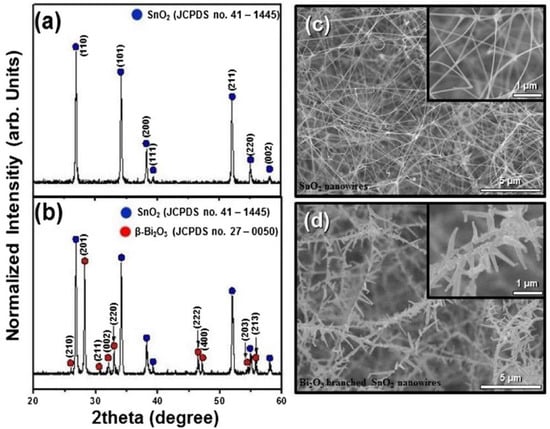XRD spectra of (a) SnO2 NWs and (b) Bi2O3-branched SnO2 NWs. SEM images of (c) SnO2 NWs and (d) Bi2O3-branched SnO2 NWs. Reprinted with permission from Ref. [54]. Copyright 2018, Elsevier.