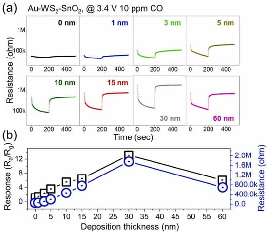In another study, Kim et al. [112] synthesized self-heated 2D pristine and Au-functionalized WS2–SnO2 core–shell NSs with different shell thicknesses of up to 60 nm on polyamide substrates. Bare and Au-decorated gas sensors with shell thicknesses of 15 and 30 nm exhibited the highest CO-sensing performance at a low voltage of 3.4 V. Figure 10a shows dynamic resistance curves of Au-decorated WS2–SnO2 with different shell thicknesses to 10 ppm CO at a fixed applied voltage of 3.4 V. Figure 10b shows the corresponding plots of response and resistance versus the shell thickness. The sensor with a shell thickness of 10 nm showed a high response to 12–10 ppm of CO gas.