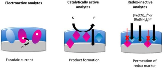 Electrochemical detection is focused on measuring changes in the electrical signal, which occur when chemicals interact with a sensing surface. There are three main electrochemical approaches used in MIP-based sensors (Figure 2). First, there is a direct determination of the redox-active analyte where the recorded faradaic current comes from direct electron transfer between the target and electrode surface. Secondly, an indirect quantification can be used via the generation of a redox-active product, which subsequently reacts at the electrode surface. Thirdly, another indirect quantification method is using a redox marker such as ferri/ferrocyanide. In this case, the diffusional permeability of the redox marker through the electrode surface is monitored. Electrochemical detection is an especially attractive technique because of its high specificity, experimental simplicity, low cost, and easy integration into portable devices. Consequently, it is unsurprising that the technique is commonly utilized within commercial sensors. In the next section, we discuss the detection of heavy metals and touch on relevant screen-printing technology, which has attracted considerable commercial interest due its low-cost and compatibility with mass-manufacturing.