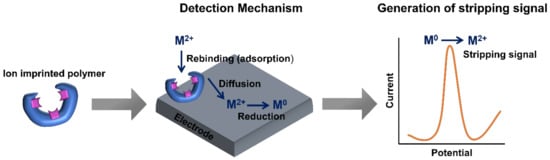 To improve the sensitivity and selectivity of electrodes for electroanalysis, IIPs are frequently fabricated to target specific heavy metals. The role of IIPs is similar to solid-phase extraction in that they are utilized to preconcentrate the given heavy metal ion onto the electrode, thus enhancing the stripping signals. A brief scheme of the mechanism of detection in an IIP-based electrochemical sensor is shown in Figure 4. In the following sections, we will review recent developments in IIP-based electrochemical sensors for the detection of three of the most hazardous heavy metals: mercury(II), cadmium(II), and lead(II).