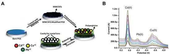 This literature review reveals that there are relatively few papers from only a small number of research groups that discuss the performance of IIP-based electrochemical sensors for heavy metal detection. One reason for the lack of research in this area may be the limited possibilities to innovate the synthesis protocol of IIPs. However, from these papers, it is clear that IIP-based sensor performance is consistently improved by increasing surface area and/or electron transfer by embedding conductive materials, (e.g., SiO2 and Fe2O3 nanoparticles, graphene, MWCNTs) into the electrode surface [99]. Precipitation polymerization is most commonly used for IIP synthesis, which is likely because nanosized particles are produced with a high number of adsorption sites per particle. Stripping voltammetry is typically utilized as an electrochemical detection method with DPV generally being favored over SWV. It is clear that potentiometric methods of detection offer a very large domain of linearity compared to amperometric methods. Furthermore, this review highlights that casting the prepared IIP material on a solid electrode and blending the IIP with graphite are the two main approaches used for the integration of IIPs with transducers. In the former case, GCEs are most commonly used, whereas in the latter, CPEs are generally favored. The reason for this may be that the imprinted material has poor adherence to the GCE, which would make sample preparation more difficult. An interesting avenue for future research is developing IIP sensor arrays, which can simultaneously detect multiple heavy metals. This is particularly relevant as numerous heavy metals are generally present in real samples. Roy et al. [100] performed a unique study that assessed the simultaneous detection of cadmium(II), lead(II), and copper(II) using a multi-template imprinting technique (Figure 5). For this, an imprinted nanowire was synthesized using MWCNTs as a core on which a layer of conducting polyarginine was cast using an electropolymerization technique. The reduction peak potentials of the cadmium(II), lead(II), and copper(II) on the pencil graphite electrode modified with the imprinted nanowire were separated completely into three well-defined peaks at 0.00, −0.20, and −0.56 V vs. Ag/AgCl, respectively.