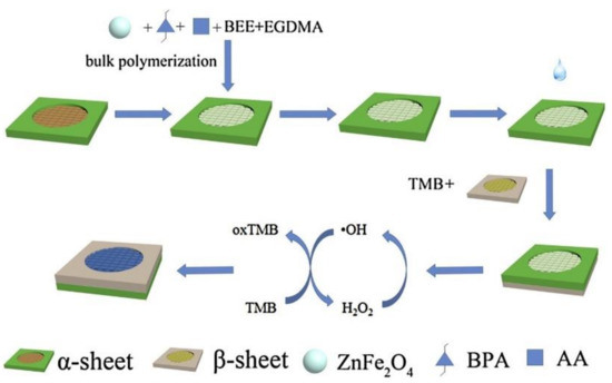 In addition to displacement assays, other MIP-based colorimetric assays have been developed for the detection of environmental pollutants. Huang et al. [122] created polymer–paper composite chips for the colorimetric detection of cadmium ions, for instance. Other assays make use of nanoparticles to catalyze a color reaction in the presence of the target. Typically, MIPs are used to extract compounds from an aqueous solution and are then transferred to a solution containing gold nanoparticles. Elution of the target compound from the MIPs leads to a color change of the solution by interaction of the compound with the nanoparticles. This mechanism was used for the detection of the insecticide cartap [124] and the herbicide atrazine [125]. The drawback of this procedure is that it typically requires a multi-step approach with several reagents employed, making it less suitable for handheld, routine environmental screening. However, Kong et al. [126] used this approach to create a paper-based handheld test strip for the endocrine disruptor BPA. They used cellulose paper on which they created a wax-like scaffold for immobilizing an acrylamide (AA)-based MIP membrane impregnated with silver nanoparticles using EDGMA and benzoin ethyl ether (BEE) as cross-linker and initiator, respectively (Figure 6). A second cellulose paper containing tetramethylbenzidine (TMB) was attached to the first paper. Solutions containing different amounts of BPA were mixed with peroxide and the paper was dipped into this mixture. Without the target molecule present, the interaction of peroxide and nanoparticles led to a blue coloring of the paper. The presence of BPA in the solution prevented this interaction from occurring, leaving the paper indicator uncolored. The color reaction was studied by taking pictures of the paper strip with a simple smartphone camera and analyzing the color intensity using Photoshop. These results illustrate how close this technology is to actual implementation in the field using handheld integrated sensor devices and paper-based dipsticks.