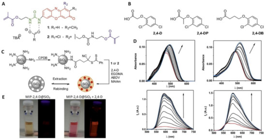 Colorimetric detection platforms are interesting from an application point-of-view due to their simple nature and the minimal post-processing of the detection signal. However, the sensitivity of the resulting platforms is usually limited in comparison to similar platforms employing fluorescent dyes. Subsequently, multiple displacement protocols have been developed over the years for the detection of various environmentally significant compounds, such as herbicides [138] and algal metabolites [127]. In addition, it is also possible to fluorescently modify the monomers themselves and incorporate fluorescence into the MIPs directly. Modification of the MIP itself holds some value over the modification of binding molecules as the primary optical transducer is situated in the polymeric network of the receptor. This has the distinct advantage of allowing the MIP to retain the optical property that has been introduced, as well as adding to the reusability of the polymer compared to chromophore/fluorophore-target-conjugates that are lost after binding. Varying approaches have shown differing success at integrating fluorophores into the structures of MIPs with traditional approaches focusing on the installation of fluorescent functional monomers, cross-linkers, and initiator molecules [139,140,141,142]. A urea-expressing fluorescent probe cross-linker that was incorporated into submicron-sized silica particles by Wagner et al. [128] is a prime example of fluorophores in MIP-based systems. The fluorescent MIP shell of the silica was proven to “light up” upon the binding of the carboxylate group present in the herbicide 2,4-D (Figure 7), shifting the observable color of the sensor from yellow to red. The developed assays showed good sensitivity (order of nM), reporting the concentrations of 2,4-D in contaminated water samples and meeting WHO requirements for the analysis of drinking water with a linear range between 20 nM and 5 μM [61].