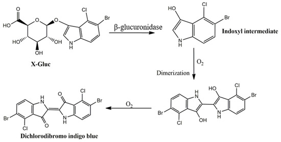 Dimerization of the indoxyl derivative from hydrolysis of X-Gluc to yield the blue indigo reporter dye derivative.