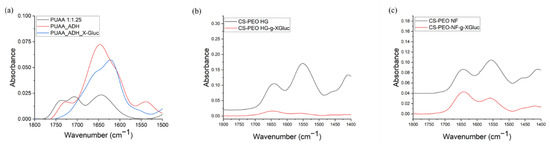 In order to implement a sensing moiety into the various hydrogel samples, the chromogenic substrate X-Gluc was covalently coupled. The successful grafting of the chromogenic substrate X-Gluc to the PUAA-ADH hydrogel films and CS/PEO NFs was assessed by identifying the characteristic bands in ATR-FTIR spectra and in particular by attributing the observed IR bands to either the chromogenic substrate or the amide bonds generated as a consequence of the covalent conjugation (Figure 5).