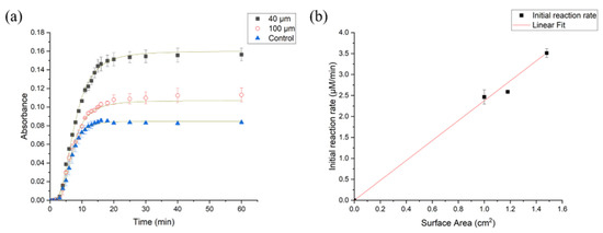 Kinetics of the reaction of X-Gluc grafted PUAA-ADH with ß-GUS followed at a wavelength of 615 nm, (a) varying the surface area of the films (using 8 mg of sample with 40 µm cuboids, 100 µm cuboids and a bulk non-structured film as the control); (b) Linearly fitted graph (forced through the origin) between initial apparent reaction rate and surface area of PUAA-ADH_X-Gluc hydrogel films.